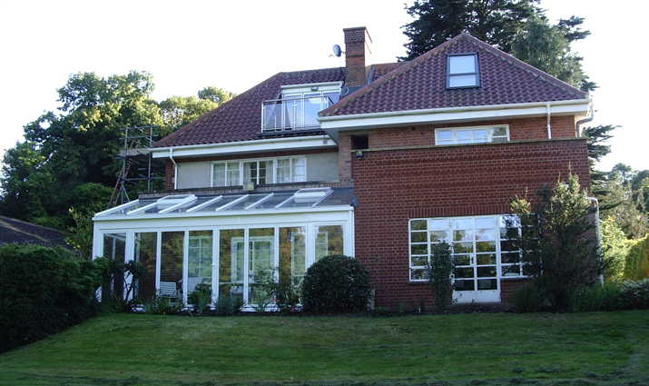 Before and After Rear. Raising of roof to permit loft conversion with balconies to new windows. Single storey rear extension with balcony above. New fully glazed conservatory.